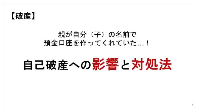 今回の動画では、自己破産を申し立てる際に、親などの家族が自分のために預金口座を作ってお金を貯めていてくれたことが分かった場合、自己破産の手続にどのような影響があるか、という点についてお話したいと思います。   ◆自己破産と預貯金等の関係 →2.   ◆親が自分のためにつくった預貯金が見つかった場合 →3....