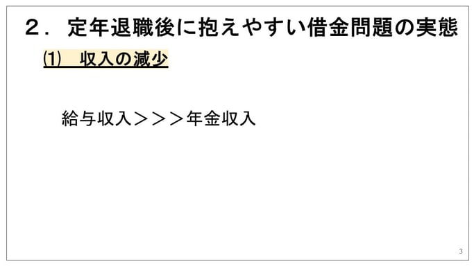 今回は「ご定年退職後の借金問題~老後の安心のために」というテーマでお話させていただきます。  実は、定年退職後に借金問題に直面し、生活設計に重たいものを感じていらっしゃる方が、意外と多くいらっしゃいます。...