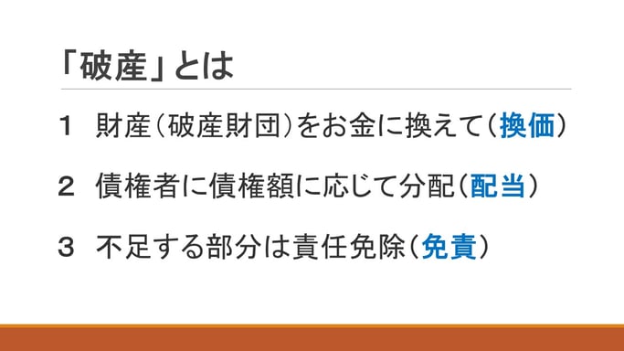 破産というのは、こういう換価、配当、それから免責(厳密に言えば免責はまた別の話なんですけれども)、これも含めて一般的には『破産』といいます。破産というのは、要するに借金が多くなった人が、持っている財産を全部投げ出してお金に換えて、これを債権者に債権額に応じて分配配当をして、それでも借金の全額弁済に充たらない部分を免責してもらうと、こういう話になります。