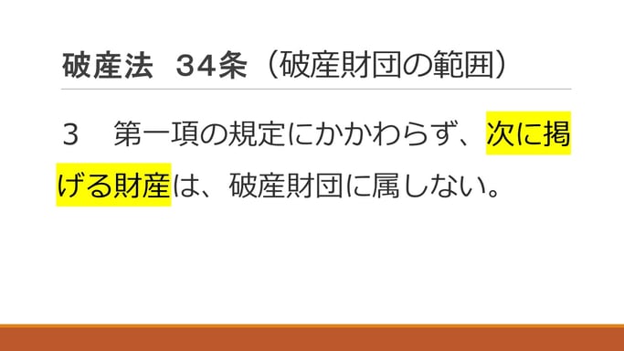 基本的には破産をする人は、持ってる財産全部が換価の対象、全部取られちゃいます、なくなっちゃいますよ、ということが破産法34条には書いてあります。