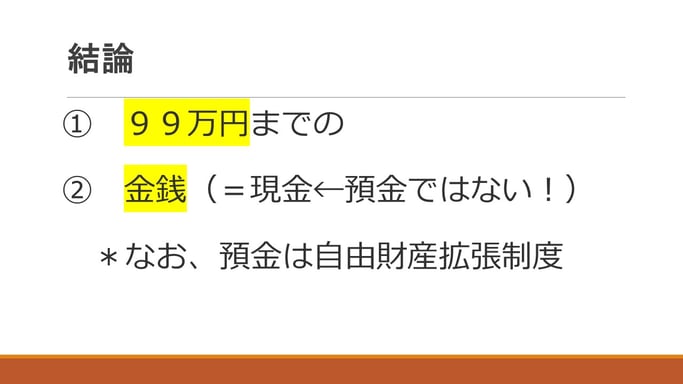やっと結論なんですけれども、結論としては99万円までの、法律には「金銭」と書いてあって、これは現金のことなんですね。お札とか、硬貨もありますけれども、「金銭」なんですね。これ、「預金」ではないんです。よく誤解される方がいて、銀行口座に計90万円あるんですけれどこれは大丈夫なんですよね?っていうふうに考えるかもしれませんが、法律は「金銭」と書いてありますので、預金は駄目なんですよね。