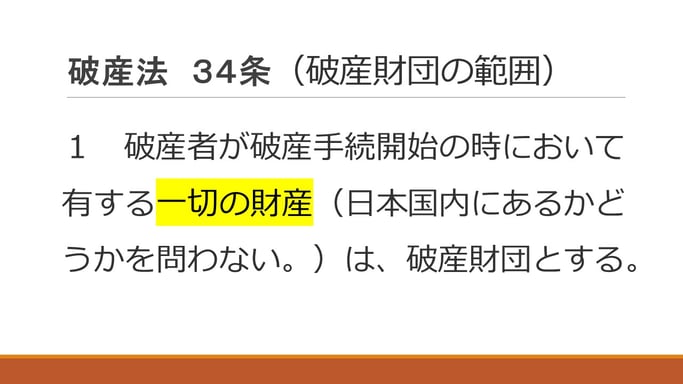 「破産者が破産手続開始の時において有する一切の財産(日本国内にあるかどうかを問わない。)は、破産財団とする。」