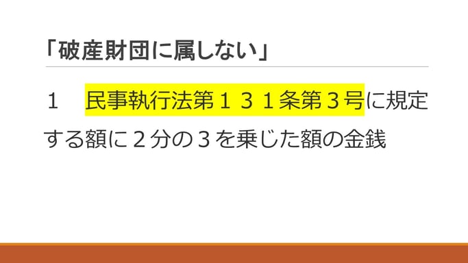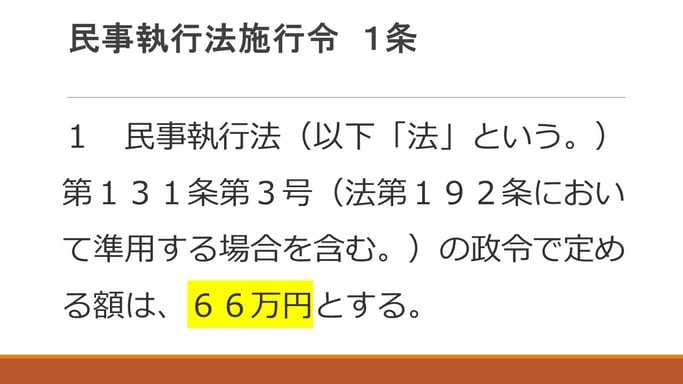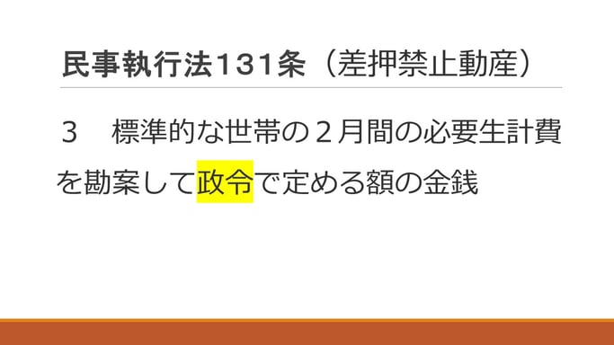 こういうのが法律がややこしい理由の一つではあるんですけれども、なんと書いてあるかというと、民事執行法第131条第3号(さっきの条文ですね)「政令で定める額は66万円とする」というふうに、これが政令なんですけれども、この標準的な世帯の2月間の必要生計費を勘案して政令で決めたのは66万円ですよと書いてあるわけですね。そうするとちょっと戻ってさっきの民事執行法第131条第3号に規定する額というのは66万円ということになりますので、66万円に2分の3を乗じた額の金銭、これが破産財団に属しない、破産をしても取り上げられない金銭ということになります。