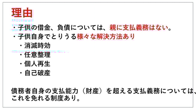 このことはご存知の方も多いかと思いますけれども、子供の借金といっても親に責任は一切ないんだということは押さえておく必要があるかと思います。親に責任はないということですね。