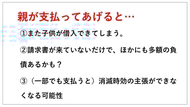 それから今回の請求書でこのお子さんの借金が全てだという保証は何もないわけですね。例えば今回50万の請求書が来てますけれども、他にも請求書が来ていない借金がたくさんあって、全部で500万あるとか、1000万あるとかいう場合に、このたまたま自宅に来た50万を返したからといって、これは氷山の一角で何も解決になってないというケースも十分あり得ます。