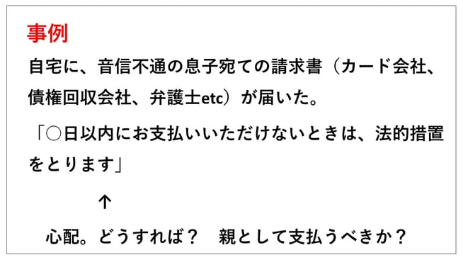 これは時々私のところの法律事務所でもある相談の一つです。どういう事例かというと、ご自宅に音信不通の息子さん宛の請求書、しばらく連絡が取れなくなっている息子さん宛の請求書が届きました。この請求書を開けてみると、請求してるのはカード会社とかあるいは債権回収会社とかそういうところの弁護士とかからの請求書だった。内容を見ると、「何日以内にお支払いいただけないときは法的措置を取ります」といったような、すごく物騒なことが書いてある。こういうものを見た親御さんは大変心配をされるわけですし、どうしたらいいだろう、やはり親として支払ってあげるべきなんじゃないか、というご相談があります。